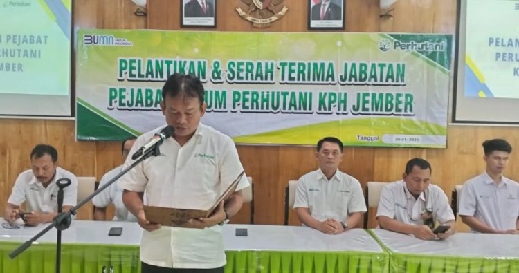 Jember (26/01/2026) - Perum Perhutani Kesatuan Pemangkuan Hutan (KPH) Jember melaksanakan kegiatan pelantikan pejabat struktural sebagai bagian dari upaya penguatan organisasi dan peningkatan efektivitas kinerja pengelolaan hutan. Penyerahan surat keputusan dan pelantikan pejabat dilaksanakan oleh Administratur Perhutani Kesatuan Pemangkuan Hutan (KPH) Jember Eko Teguh Prasetyo bertempat Aula Kantor Perum Perhutani KPH Jember dihadiri oleh segenap Wakil Administratur, segenap Kepala Seksi (Kasi), segenap Kepala Bagian Kesatuan Pemangkuan Hutan (KBKPH) beserta perwakilan Kepala Resort Pemangkuan Hutan (KRPH), segenap Kepala Sub Seksi (KSS), Segenap Kepala Tempat Penimbunan Kayu, Komandan Regu Polhutmob, Kepala Urusan Pelaporan dan Kesisteman, Senin (26/01/2026).