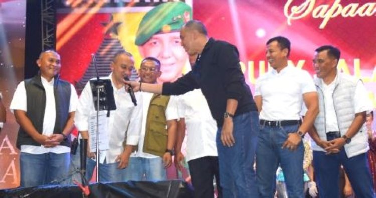 Tak kalah serunya panggung prajurit tersebut di meriahkan oleh artis ternama yaitu, Dewi Persik, Ndarboy Genk, Jihan Audi, Sephin Misa dan artis lokal lainnya dengan diiringi musik oleh Hollycoustick Band.(pen)